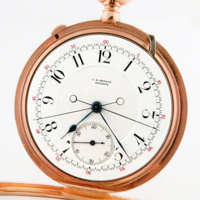 Wonderful complicated antique timepiece: C.H. Meylan Split Seconds Chronograph ‘Rattrapante’ Pocket Watch in beautiful 18K Pink Gold Open Face Case. C.H. Meylan was an Elite Swiss Watchmaking Trademark from 1880s-1900s and the quality of their products rivaled the best such as Patek Philippe and Vacheron Constantin. This particular example is a high grade C.H. Meylan Split Seconds Chronograph ‘Rattrapante’ Pocket Watch which contains many top grade features exemplified by this highly respected brand. It contains solid gold chatons or jewel settings and superbly finished springs and levers in all hand-finished parts done with chamfering and high polish throughout.