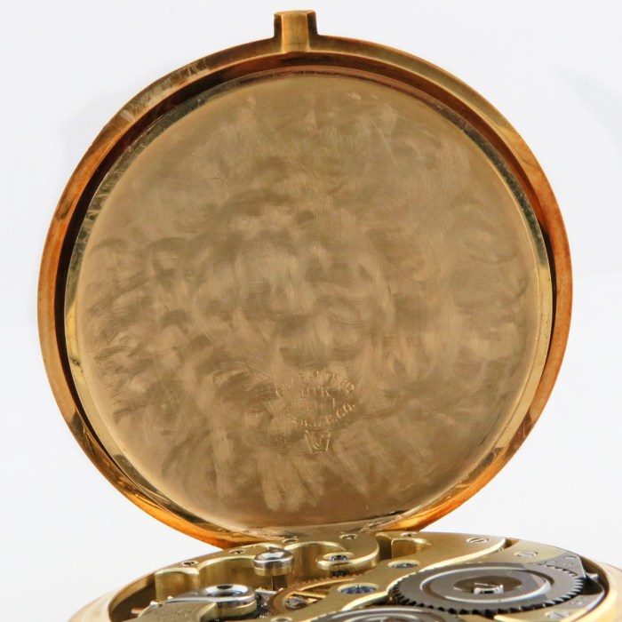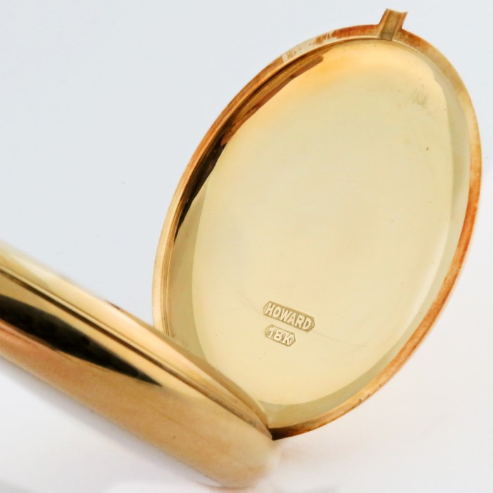 REMARKS: Super rare and prestigious Edward Howard Presentation Pocket Watch, this is truly a collector’s grail pocket watch. Even though exact production numbers were not known, by most scholarly estimate and historical accounts around 300pcs Edward Howard Presentation Pocket Watch was produced by E. Howard (also known as Keystone Howard) Watch Co starting from 1912. The Edward Howard was the highest grade and most expensive pocket watch ever sold by E. Howard (Keystone) Watch Co that the retail price was listed at $350 starting in 1912. It is quite the unique watch with various features that set it apart from other pocket watches in that era. First of all when the caseback and dustcover are opened one can see that the jewel bearings are made from ‘oriental blue sapphires’ instead of the common ruby bearings. Also, the bridges were designed with flairs on the ends that looked similar to talons from birds of prey. It is also quite rare for a serially produced American watch movement from 1912 to have a free-sprung balance with no regulator. Much like high grade swiss watches of that era, the Edward Howard also featured wolf teeth winding wheels with extra fine sandblasted finish. Case in 18K solid gold with a white porcelain dial that is simply marked with ‘EDWARD HOWARD’, this watch serves as a testament to the prowess of American watchmaking which makes it a grail watch for many collectors.