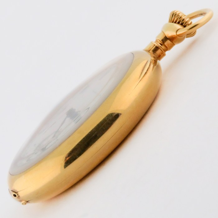 | CONDITION: | Runs, Winds, Sets, Not Serviced. Cosmetically for a 110 years old watch this Edward Howard is in fantastic shape. The dial has only a short and faint hairline crack at the outer edge of the enamel dial between 22-23min marker. There is a tiny amount of fading to the EDWARD HOWARD text. All 3 purple colored hands are original and are in great shape. The solid gold caseback has a very shallow dent near the center-right. Case band/body has a tiny ding at the 10 o’clock position. The caseback has been initialized and dustcover has been fully engraved with the original owner’s name and presentation provenance. Movement is likewise in great shape cosmetically. The case closes tight and caseback does not exceed the 90 degree angle when opened. Glass crystal is possibly original and has a fairly large and deep scratch near the center right area with a couple of shorter scratches right above the 4 o’clock position. The bow is nice and tight. Diameter is 51mm, total weight 101.5g. |
